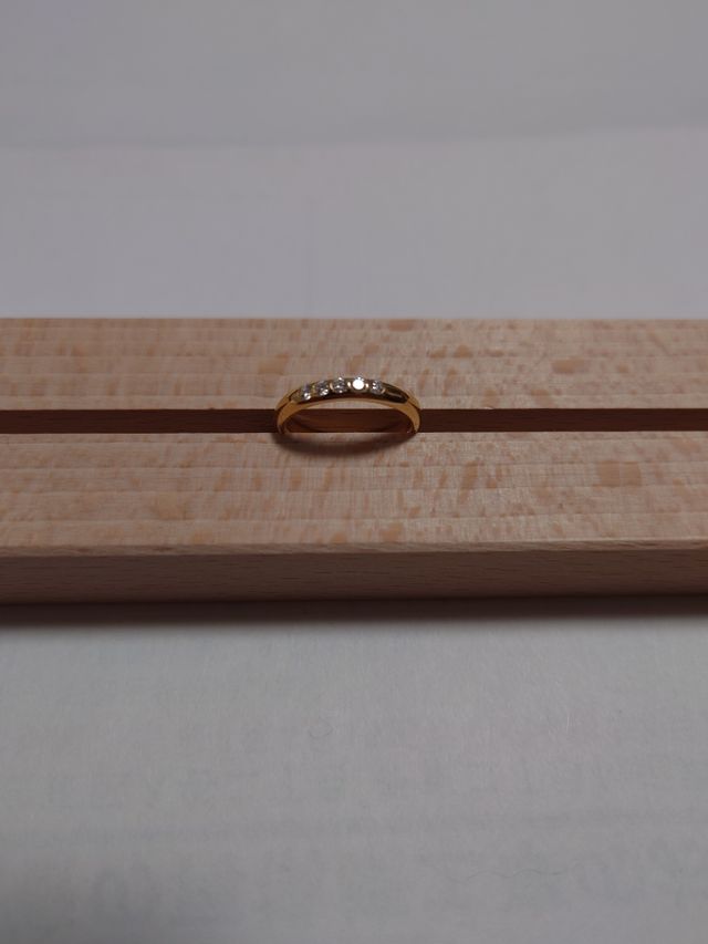 今回初めてゴールド素材の指輪にしたが主張しすぎない上品な色味で、デザインもシンプルで長く使うことが出来そう。ダイヤがとても綺麗でプラチナの他の指輪と重ね付けするとゴージャスな感じになり、特別な時にも使うことが出来る。