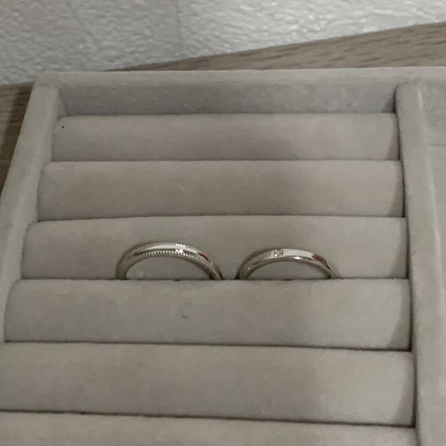 私はシンプルで、ダイヤモンドをいれたく、夫はラインの入った少しおしゃれなものを選択。シンプルでありながら、高級感がありエレガントさがある。とっても可愛くて付け心地がよいです。このあと4件ほどブライダルショップを回りましたが最初に試着したこの指輪にもどってきました。