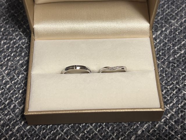 婚約指輪と合うように、V形のものをを選びました!彼の方は、見てすぐに気に入ったようで、ブラックダイヤになってます。シンプルに、と思ってましたが、やっぱり見てるとキラキラしたものに目が惹かれてしまいます!