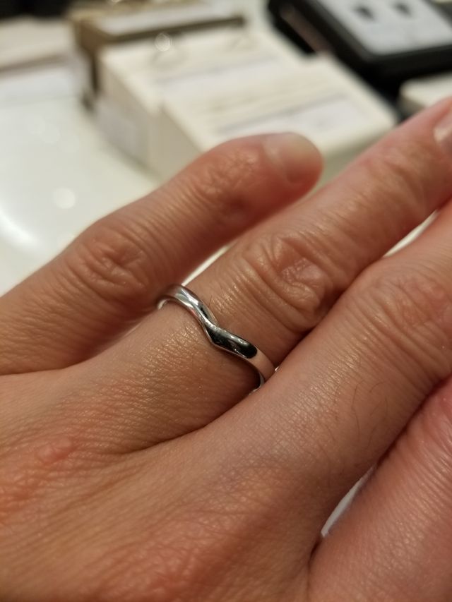 少しカーブする事で、指を細く見せることができます。 指輪の形がハートの形をしていて、彼女がそれを見たらすごく気にいって喜んでくれました。後カーブの所にダイヤモンドがついていてすごく可愛いなぁと思います。