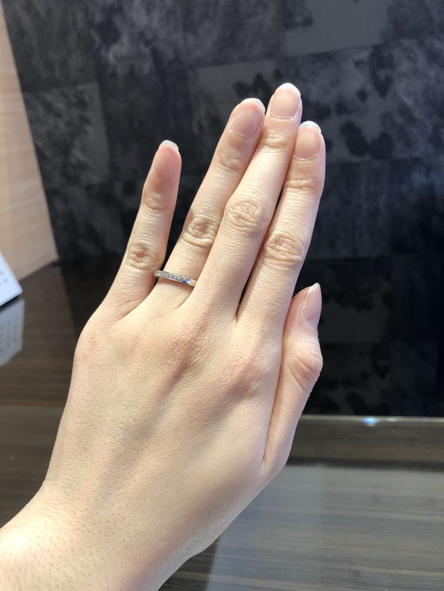 幾つか試着した際に、ダイヤが多い方がいいなぁと思いました。始めは着け心地を優先してウェーブタイプを検討しておりましたが、再度足を運んだ際にストレートタイプに惹かれ、幅の太いものも試着してみましたが比較的細めなこちらにしました。