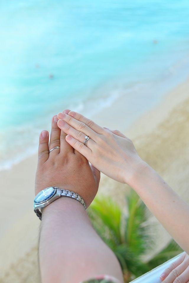 婚約指輪との重ね付けをした時に婚約指輪の1石から結婚指輪の5石が繋がって流れているのが可愛いなと思いました(^^)