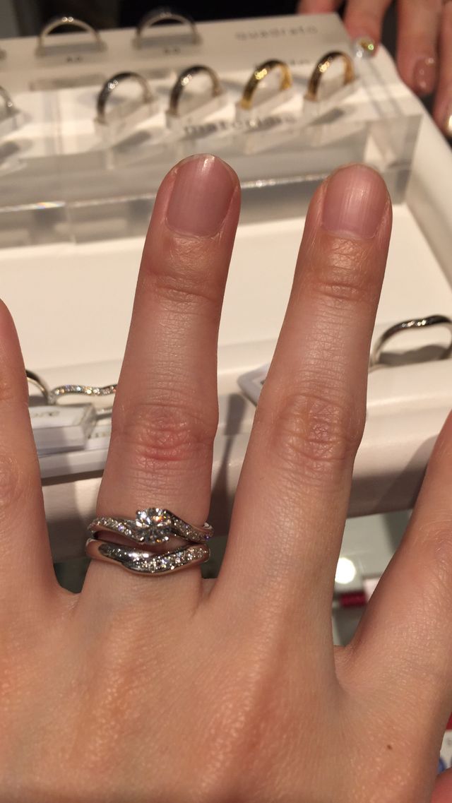 婚約指輪に合うように軽くV字になっていて重ねて着けても可愛かったです。ダイヤモンドが少し入っていて単体でも着けて嬉しくなるようなデザインでした。イエローゴールド、ピンクゴールド、プラチナと選べるので自分好みにカスタマイズできるところが気に入りました。
