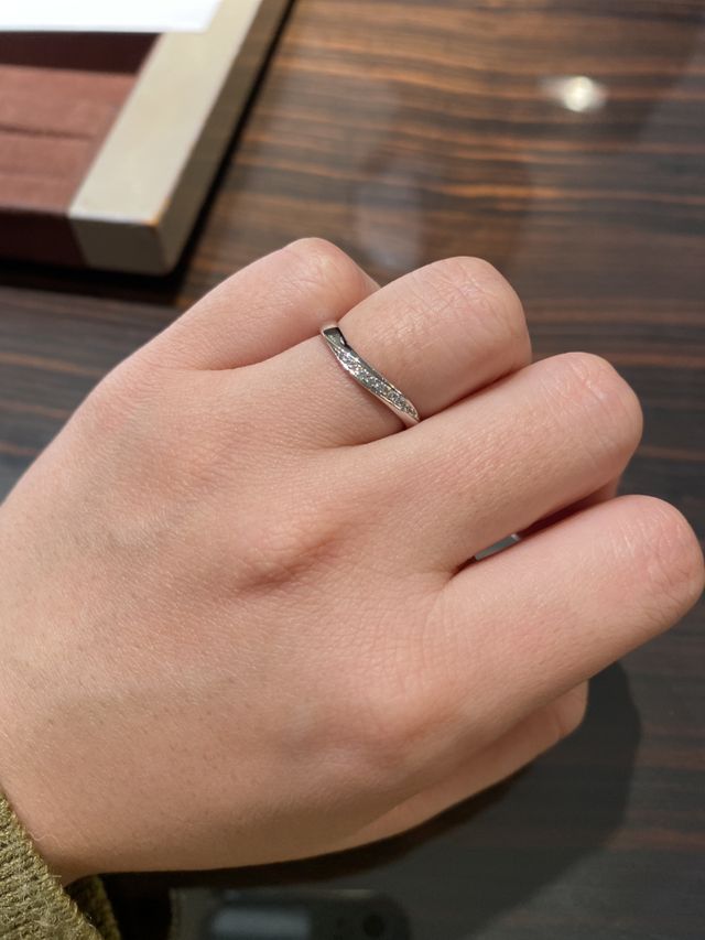 デザインがSで、ダイヤモンドが斜めに入っており、つけた時の指馴染みがよかった。名前にひかれて、「100年の約束」という意味が込められていて、これからも続くということで夫婦がずっと続いていくようにという希望も込めて選びました。