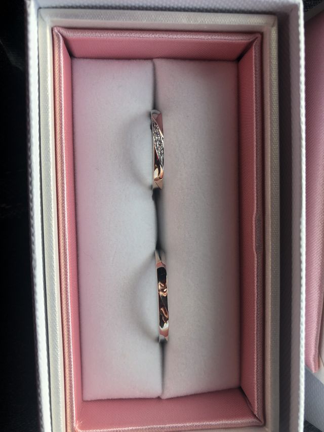 シルバーとピンクゴールドの2色が使われていたり少し変わったデザインも沢山あったのでそちらもおすすめです。そして納品の時の箱もとても可愛いかったです