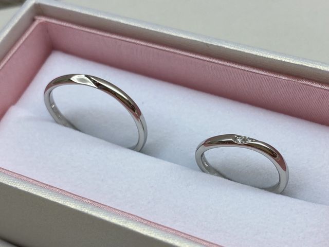 第一印象が1番良かったものに決めました。シンプルなデザインではありますが、指輪に少しカーブがかかっていて、着けた時に指がキレイに見えるところが気に入りました。また、ペアの指輪を重ねるとハート模様になるところも可愛くて気に入っています。