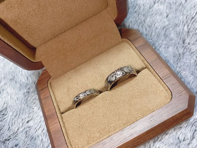 たった1人の職人さんが全て手彫りで一生物の2人だけの指輪を同じ日に彫ってくださるのでそれぞれの指輪の雰囲気が変わることもなく、安心して特別な指輪が作れます。また、納品時には、購入した指輪のサイズや種類、職人さんの名前が書かれたカスタマーカードをいただけます。