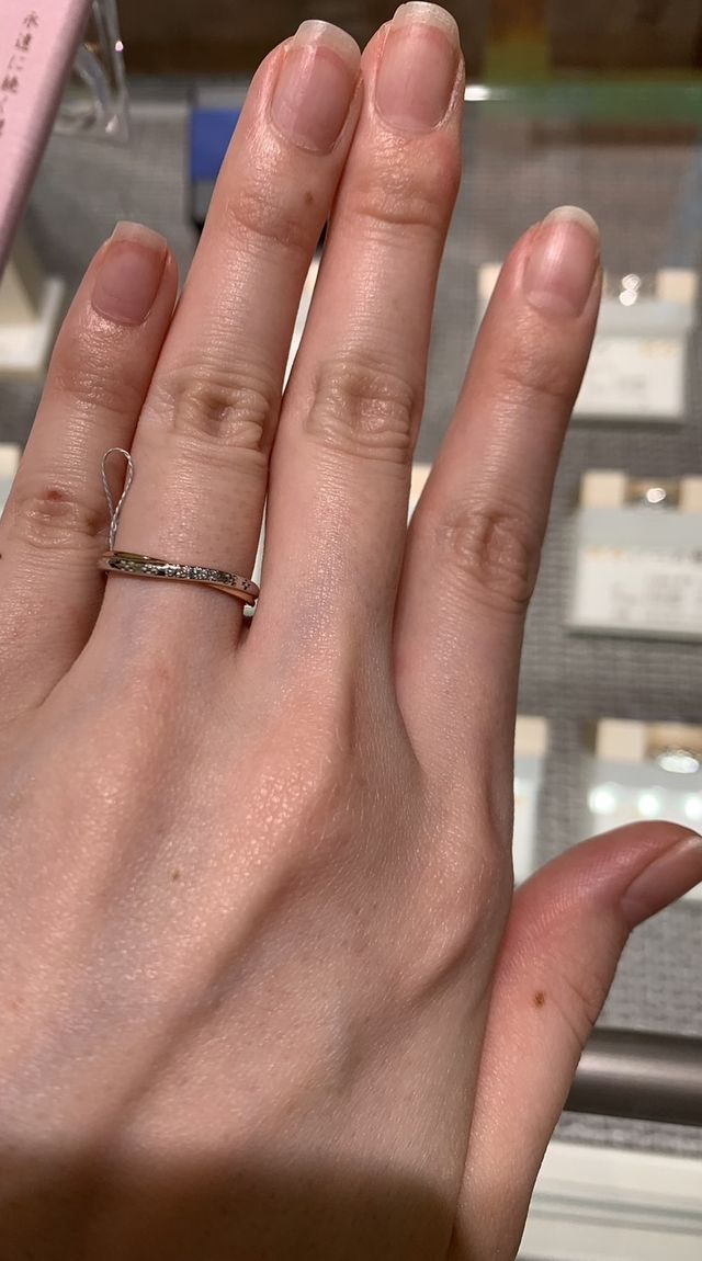 細身で流れるようなデザインがとても印象的だった。指が長く細く見えるのでとても映えるデザインだと思う!ミンサー+ダイヤで可愛らしいデザインだった!男性用も細身のデザインだったので、もう少し太めのデザインがあっても良いと思った。