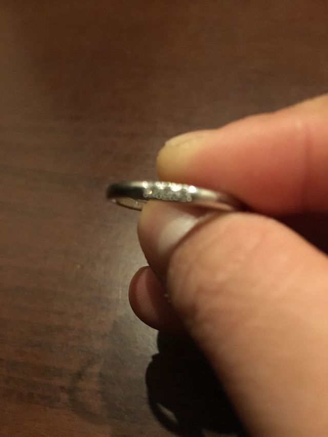 最初は主人と同じくシンプルな指輪にしようと思っていたのですが、お店のショーケースに入っていたプチッと光る3粒のダイヤがとても可愛いくて一目惚れしました。店員さんにもイメージに合っていると仰ってくれたのでこちらの指輪に決めました。