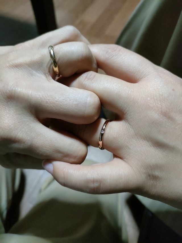 カジュアルなイメージをもち、ゴールドで作りたかった。同じゴールドでも肌馴染みのよいピンクゴールドなどの色が複数あり、妻はピンクゴールドにした。ゴールドならではのペアデザインをセミオーダーできて大変満足。