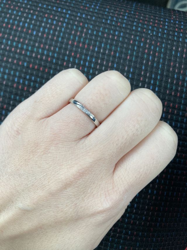 元々石が斜めに入っているデザインはあまり好みではなかったのですが、こちらの指輪はとてもさりげないデザインでミルも可愛らしく、一目で気に入りました。