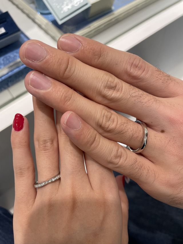 レディースの指輪のデザインがとてもかわいく選択しました。ダイヤがちりばめられておりとても華やかで華奢な指輪であるところが魅力的です。メンズの指輪も同じデザインでダイヤが無しとなっていって曲線がきれいです。