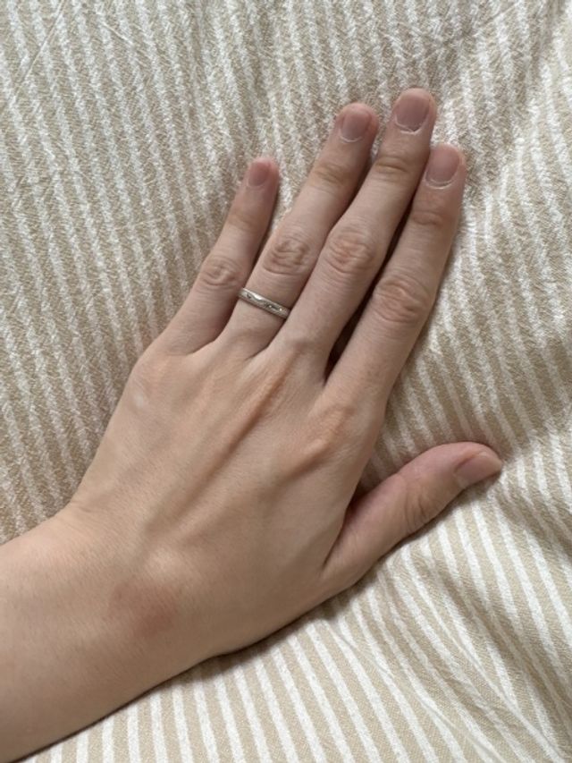キラキラ光る鏡面仕上げとミルグレインのデザインに、一目見てこれだ!と思いました。もともとはダイヤの入っているものでしたが、自分が指の根元が細くて指輪が回ってしまうのもあり、ダイヤなしにして夫とお揃いにしました。ダイヤなしでも十分美しいのでとても満足しています。