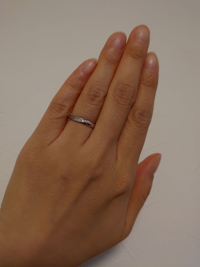 結婚指輪の買い換えで購入しました。ダイヤモンドが斜めに9粒入っており、シンプルすぎず、派手すぎず、控えめにキラキラしているところが気に入りました。エタニティリングのようなもっとダイヤがたくさん入っているものとも悩みましたが、結婚指輪なので一日中着用することを考えたら、こちらにしてよかったと思います。