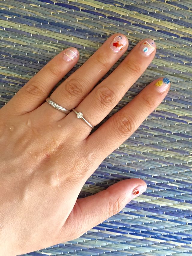 何粒か入っているダイヤモンドのうち一粒だけがピンク色になっているところが可愛くて、太すぎない指輪が好きだったので、シンプルな形が気に入りました。石が斜めに入っているところも素敵だと思いこの指輪に決めました。
