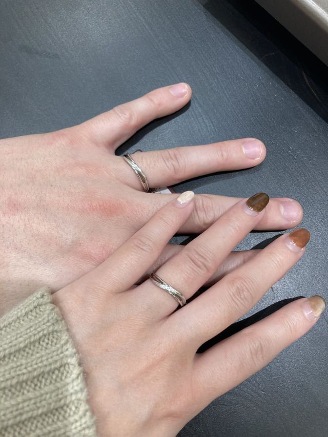 一番最初に行ったブランドがROCCAさんで、デザインに一目惚れして、婚約指輪との重ね付けもぴったり合いました。一応、他のブランドさんも見て周りましたが、最初の指輪が忘れられず、もう一度来店してやっぱりこれだと思い購入させていただきました。
