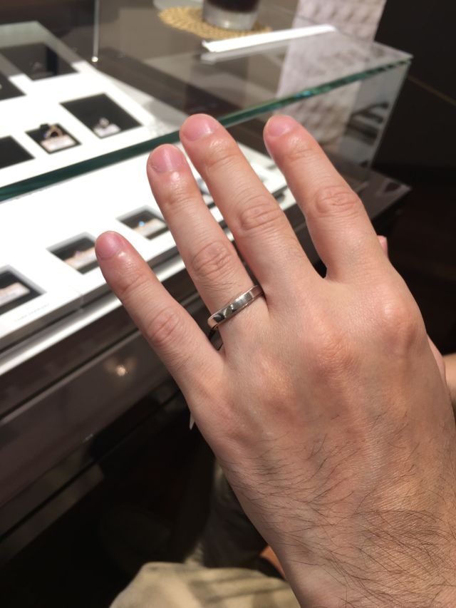 普段指輪を着けない彼の指にどんな指輪が似合うのか分からず、たまたま着けたミル打ちリングがしっくりきたようだった。太さも少し太めのほうがいいことがわかった。他にもつや消しリングも有った。価格も良心的だった