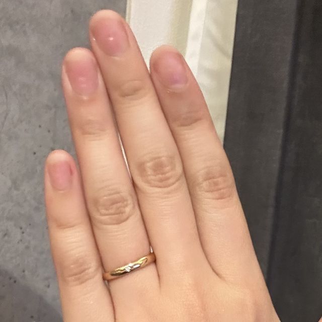 ピンクゴールドが自分の肌色に合うと思い、試着することにしました。太さがちょうどよく、センターに1粒のダイヤモンドがセットされているシンプルなデザインだと感じました。飽きが来ないデザインなところがおすすめです。