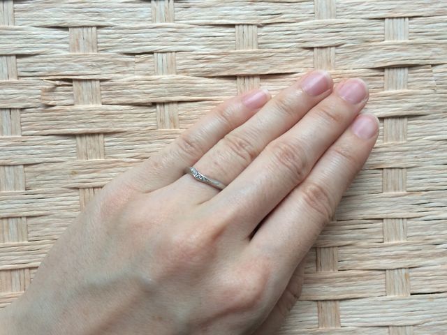 シンプルなものが欲しかったのですが、シンプルなのに特徴的なウェーブラインが指を細く見せてくれそうだったので選びました。リングの幅、素材なども選択できるので、より一歩踏み込んだデザインを彼と二人で選べたので思い出にもなりました。