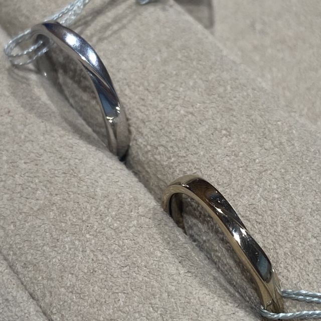 ねじれがデザインの中に欲しかったのでこのデザインを選びました。石なしが良かったので、石なしのデザインが選べた点も良かったです。艶消しのものとも迷いましたが、試着した姿を全身鏡で見て指輪の輝きが美しく、結婚指輪らしさを感じたので艶ありのものを選びました。色味は自分がイエベなのでゴールドのものを探していましたが、シルバーとゴールドの中間のシャンパンゴールドをオススメしてもらい、馴染みが良かったのでこちらに決めました。
