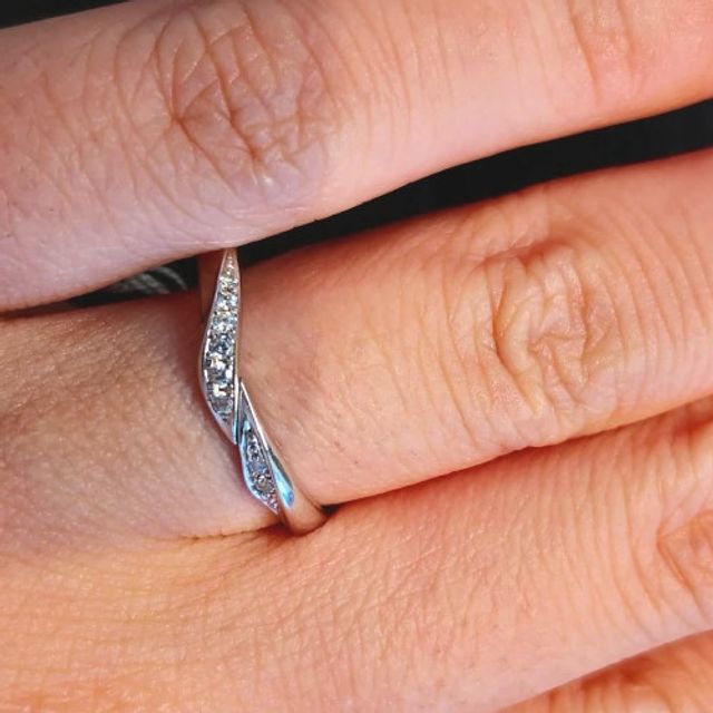 埋め込まれたメレダイヤがキラキラと輝き綺麗ですし、ひねりの入ったデザインが個性的で上品な印象があります。あらかじめネットで候補を絞っておいて、実際に試着した中で自分の指にぴったりときたのを選びました。つけ心地も抜群に良いですね。