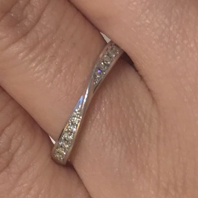 細身のリングであり華奢な感じで私の指にフィットしていると思いました。また埋め込まれたメレダイヤの輝きはしっかりとしており綺麗ですし、婚約指輪との重ね付けがしやすそうなデザインで使いやすいと感じたのも決め手になりました。