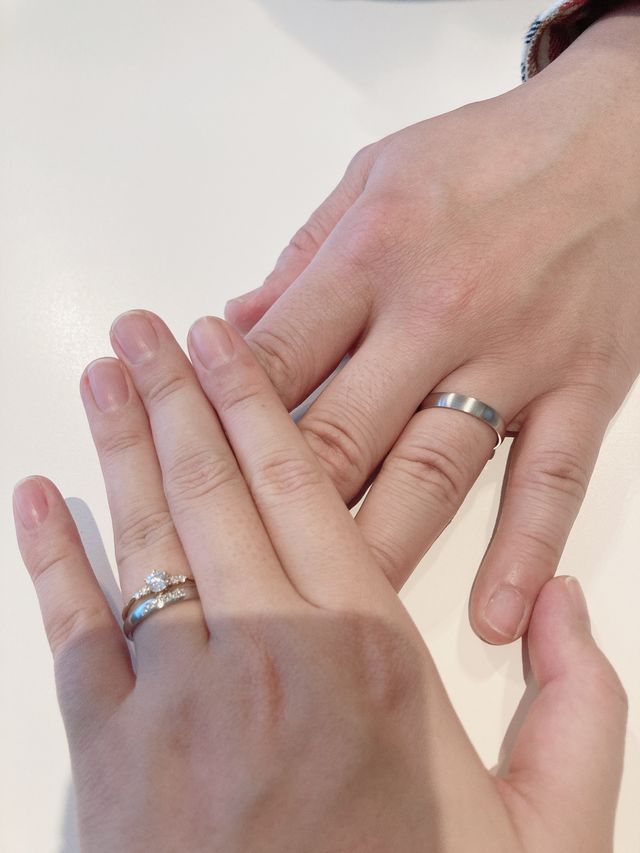 シンプルなデザインで、婚約指輪と重ね付けした場合にバランスのいい指輪を選びました。ヘアラインで傷が目立ちにくくナチュラルなデザインも気に入ったポイントです。メレダイヤモンドも輝きがあり、シンプルでも華やかさがあります。