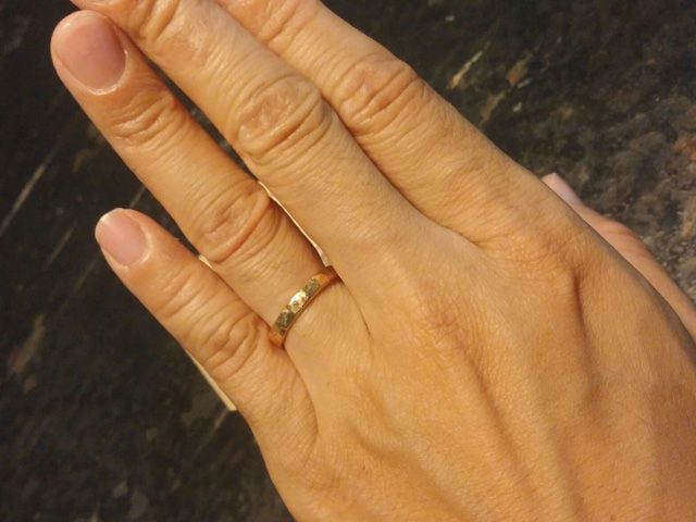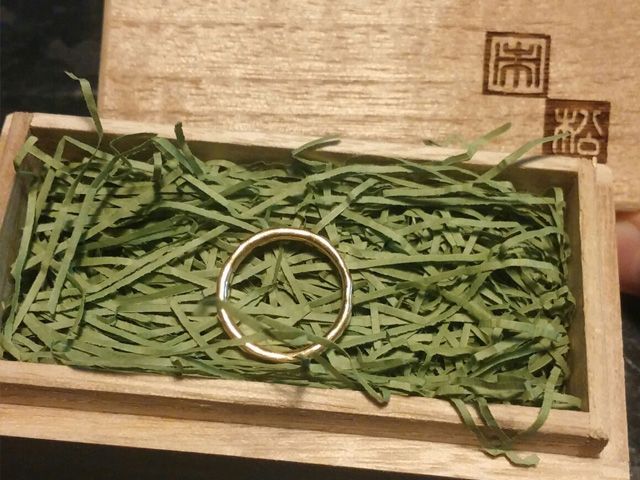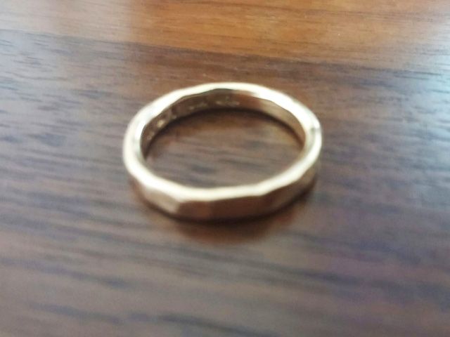 結婚指輪はずっとこれに決めていたという、主人たっての希望で、このブランドの指輪にしました。シンプルだけど、飽きの来ないデザインは自分もとても気に入っています。市松模様のように凹凸が入っており、光によってきらめくところが好きです。