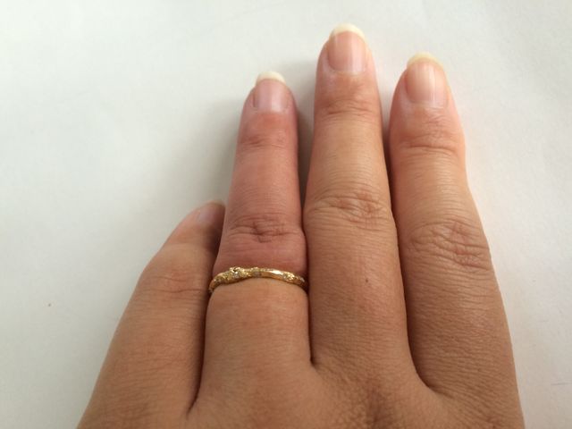 木の枝をモチーフにしたベースに小さなダイヤが散りばめられいるデザインが、とても可愛くて気に入りました。結婚指輪は長く着用するものなので、シンプルなデザインの方がいいのかな、と迷ったのですが、見るたびにテンションの上がるこのデザインがずっと幸せを感じられそう、と思い購入しました。パートナー用はプラチナカラーでダイヤがないものです。二人とも田舎生まれだったので、木の枝をモチーフにしているこの指輪がとても気に入りました!