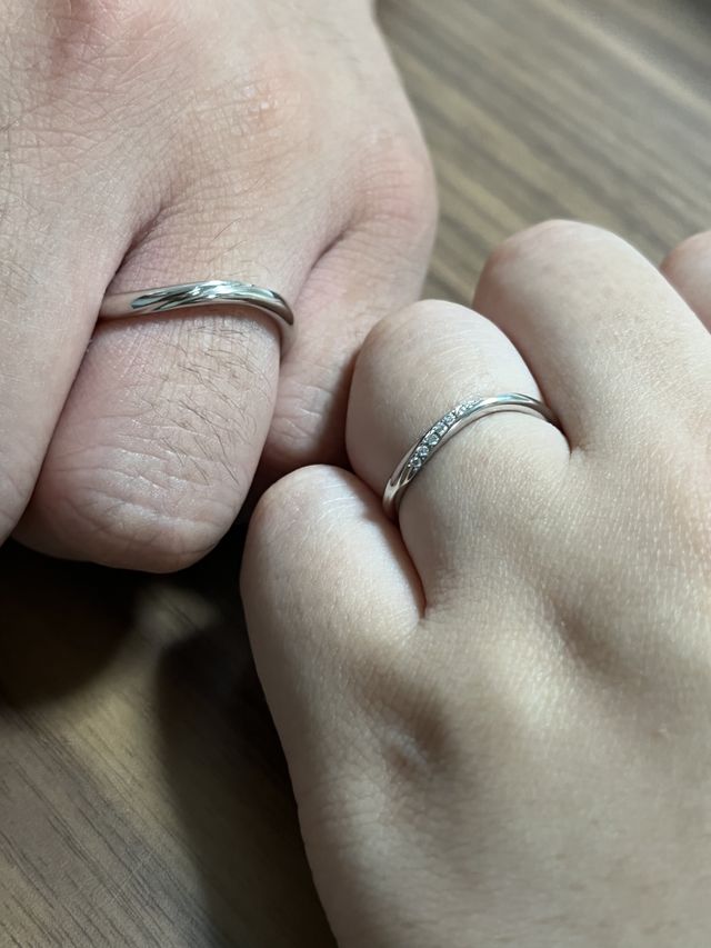 女性用はどの角度でも石の輝きが美しく指が綺麗に見え女性らしさがありこちらにしました。
