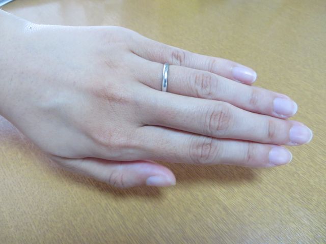 はじめはダイヤが付いた指輪も検討していましたが、仕事中にも着けることと、どんな場面でも着けられることに魅力を感じてシンプルなものに目が行くようになりました。その際にシンプルな中にも独特の輝きがあるこの指輪に良さを感じました。