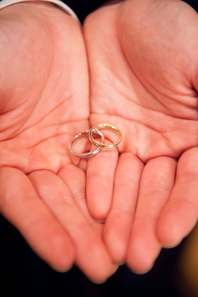 ペアリングであること、10万円ぐらい、旦那さんの方はつや消しであること、という条件で探していました。色んなジュエリーショップを巡って気になったものをいくつも試着しました。そして、2人とも気に入って、2人とも似合うこちらのデザインに決めました。私の方はプラチナとゴールドの2トーンが珍しいみたいで、友達からも好評です。