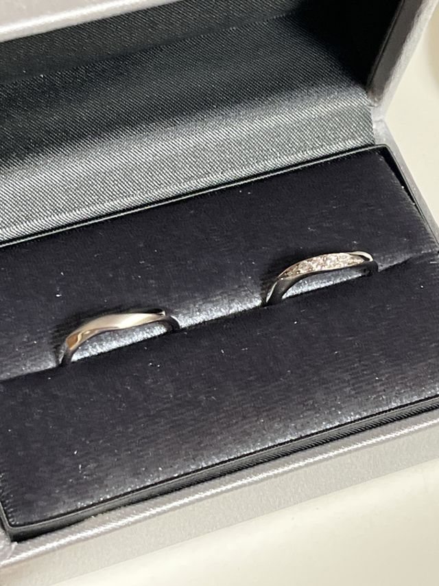 私のは真ん中にマット加工が入ることでラインが際立っていて、妻のは輝き重視でダイヤが散りばめられています。