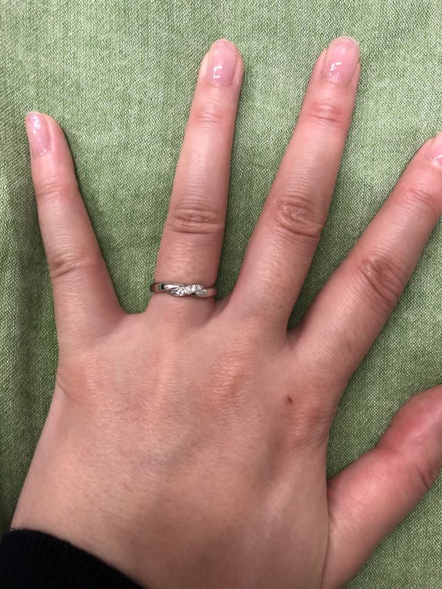 1〜3石で絞っておりました。また指が4号で細いので3石でも目立ってしまう気がしたので斜めにラインが入っているといいな、と考えたところぴったりでした。また斜めのラインの中でも少しぷっくりとしたまるみのあるデザインが気に入りました。