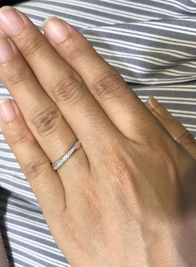 ハーフエタニティのプラチナとピンクゴールドのコンビリングが希望だったのですが、商品ラインナップの中にはプラチナ一色のものしか無く、相談した所オリジナルで作ってもらうことができました。