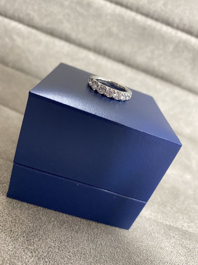 彼がハーフエタニティでダイヤモンドが大きいものをつけて欲しいとのことで何店舗かまわりました。