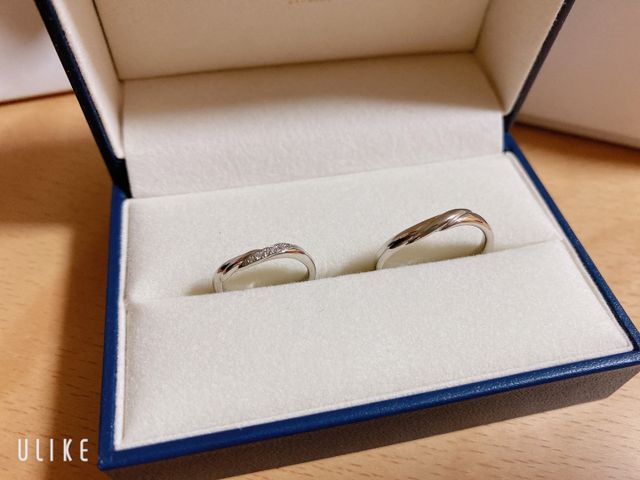 最初は石なし、シンプルなストレートデザインを希望していたのですが、色々試着していくうちに輝くダイヤに見惚れていきました。一般的な太さでありながらも、カーブによってしっかりとした存在感があるこちらに決めました。