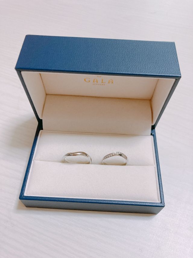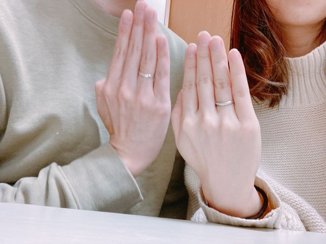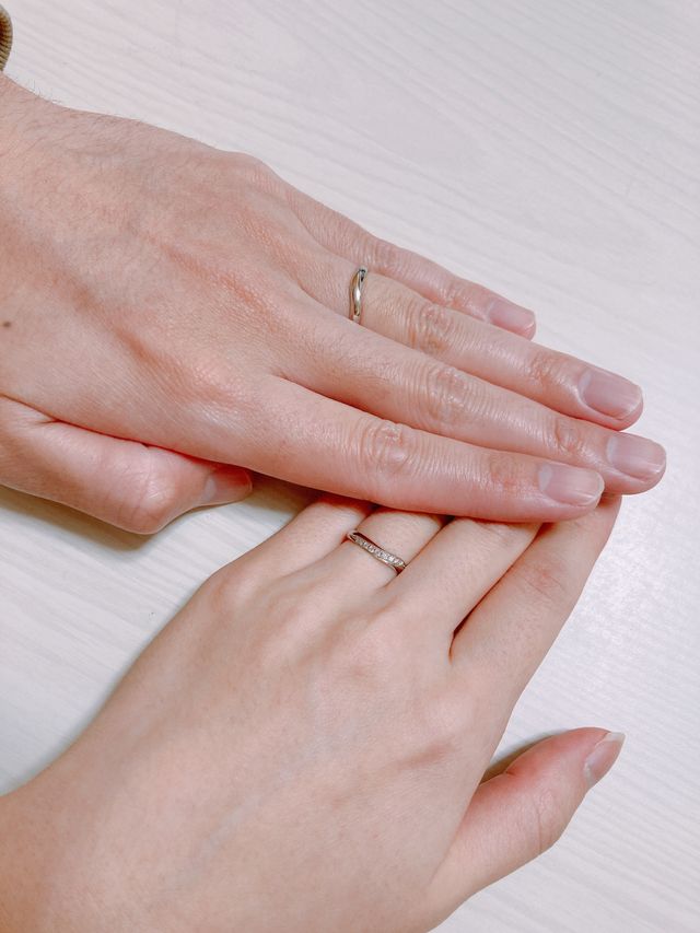 価格も14万代(1本7万代)と、自分達の予算とあっていた点が第一の指輪の決め手です。また付けた時の軽さと、細身のリングのため手に馴染みやすかった点も気に入りました。長く付けることを考えてシンプル、かつ可愛らしいデザインのものがあったので良かったです。