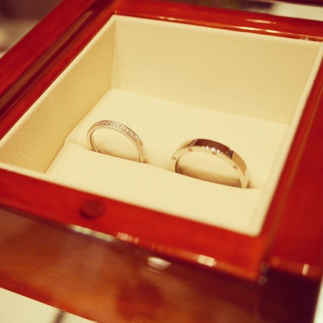 細身でアンティーク調のデザインのものを探していました。試着してすぐに気に入り、いろいろ試したらと彼が言ってくれたものの、ほぼ即決でした。華奢な指輪の内側には誕生石であるエメラルドを入れてくださり、とても素敵な指輪に仕上がりました。