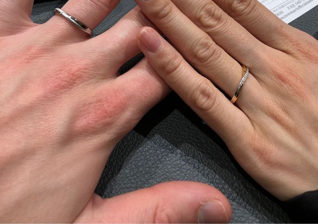 コンビネーションリング(プラチナ950とイエローゴールド)でありとても華奢に見せてくれるリングでした。また、結婚指輪とのコラボもあり、揃えるのも素敵だなと思いました。ダイヤモンドが綺麗で流れるようなデザインです