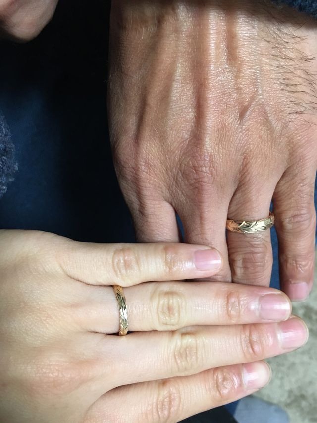 シンプルなデザインにしようか迷いましたが、以前からハワイアンジュエリーが欲しかったので、この指輪に決めました。旦那と肌の色が違うので、旦那はピンクゴールド、私はイエローゴールドにしました。主張が強すぎず、かわいいデザインで気に入っています。