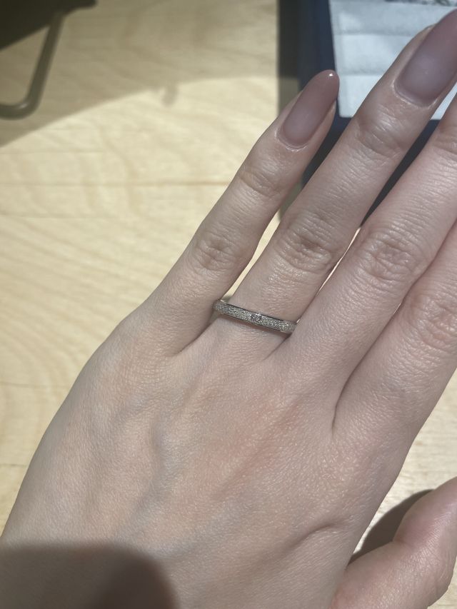 真ん中だけザラザラした加工がされており、さらに真ん中にダイヤが埋め込まれています。光に当たると全体的がキラキラしてキレイめ系のデザインでとても可愛いです。ただデザインがしっかりしているため重ね付けはあまり合わないかと思います。