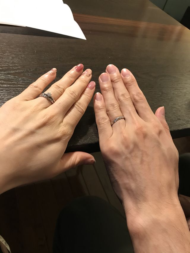 婚約指輪と重ねてつけたかったので、指輪のバランスを考えました。夫婦別々のデザインも検討しましたが、結婚後も長く着用するものなので、お揃い感のある指輪にしました。セミオーダー で好みに直すことができたのでこの指輪にしました。