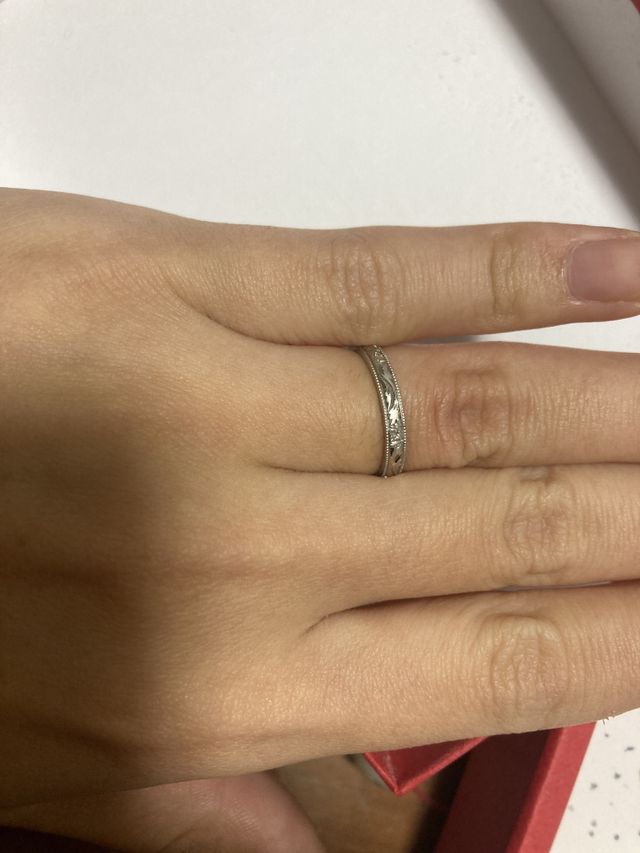 プラチナに蔦の葉のデザインがぐるりと一周あしらわれています。両端はミル打ちしてあります。オリジナルでダイヤモンドを真ん中に入れました。お風呂や手洗いでも外さず使えるので、とても便利です。手を動かすたびに蔦の刻印がキラキラと光って綺麗です。