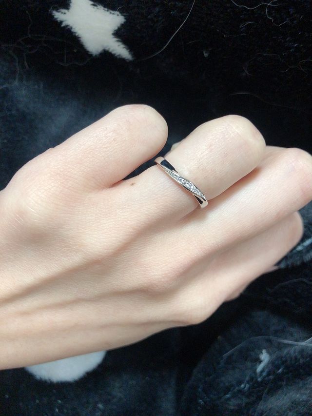 中指の上から小指の付け根へ向かって星が流れるようなダイヤのラインが指を綺麗に見せてくれるデザインになっています。華奢ながらも存在感はばっちりです。また、指輪の内側まで模様が施してあるのが素敵に感じます。購入から1年経ちますが今も綺麗に輝いてくれています。