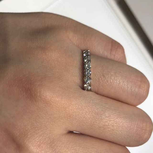 シンプルでありながらしっかりとした存在感を持つハーフエタニティリングであり、ラインの幅があるので耐久性などの点でも安心だと思います。ダイヤモンドの質が良い割に値段が抑えめになっているのでコストパフォマンスが高く、それが決め手となりました。