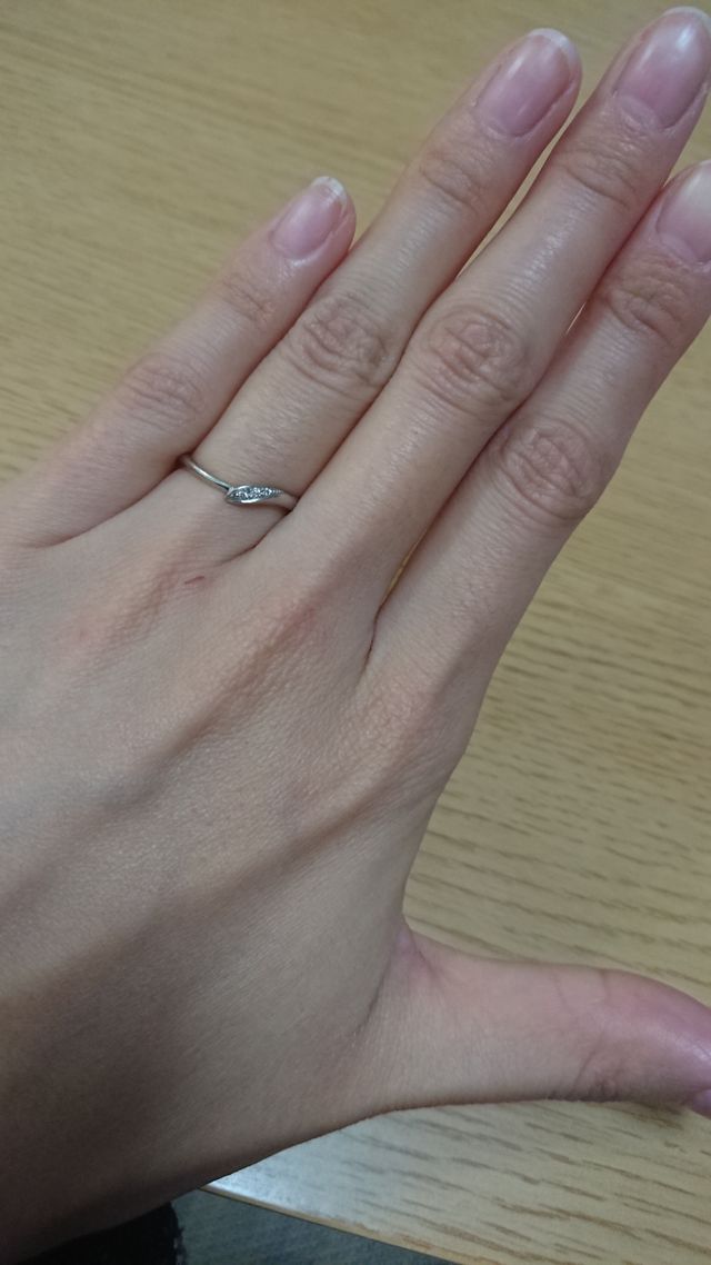 指が細く長く見える華奢なタイプの指輪が希望だったので、細めの指輪でV字になっているのが理想通りでした。