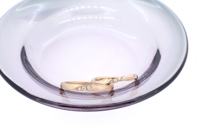 フルオーダーで依頼しました。色味はピンクゴールドですがピンクが強くないので肌馴染みが良いこと。指が綺麗に見えるねじりデザインが気に入りました。アクセントで石を入れて、ファッションリングに近いようなデザインにしました。