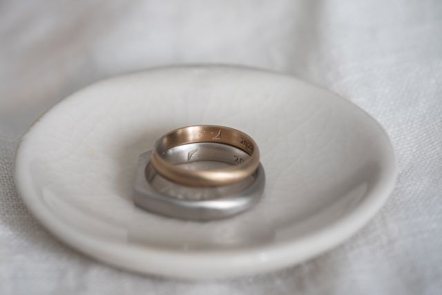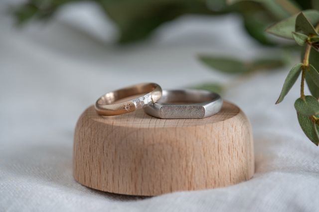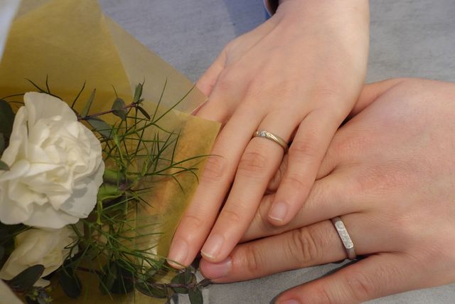 指輪のデザインでテクスチャーを選べるのが良かったです。ダイヤモンドで表面に傷をつけたダイヤモンドマットのきらめき感に一目惚れし、絶対デザインのどこかで使いたいと思っていました。夫婦でデザインを合わせにいくのではなく、お互い好きなデザインを選び、形は違うけどテクスチャーを揃えたりできて自分たちらしい仕上がりになったと思っています。