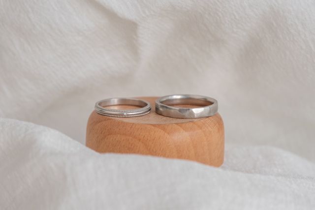 形や太さ、デザインはそれぞれ似合うものが良かったので、どうしようかと悩んでいましたが、素材や加工など質感だけ揃える提案をしていただきこのデザインに決めました。